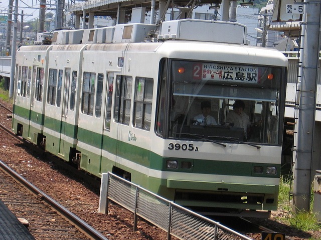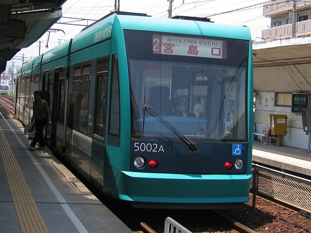 ぐりーんらいなー | 商工センター入口駅 | 広島電鉄の宮島線を走っているぐりーんらいなーです。 宮島線の電車はほとんどこれか下のグリーンムーバーに置き換わっちゃいました。 |