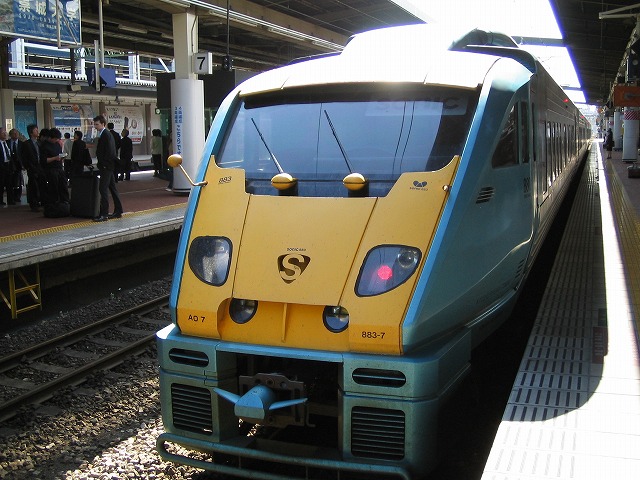 特急ソニック | 博多駅 | 博多−大分間を走っているソニックです。この列車は小倉駅で進行方向が変わります。 小倉でみんな立ち上がるので降りるのかなと思ったら、座席をくるっと反転させてました。 |